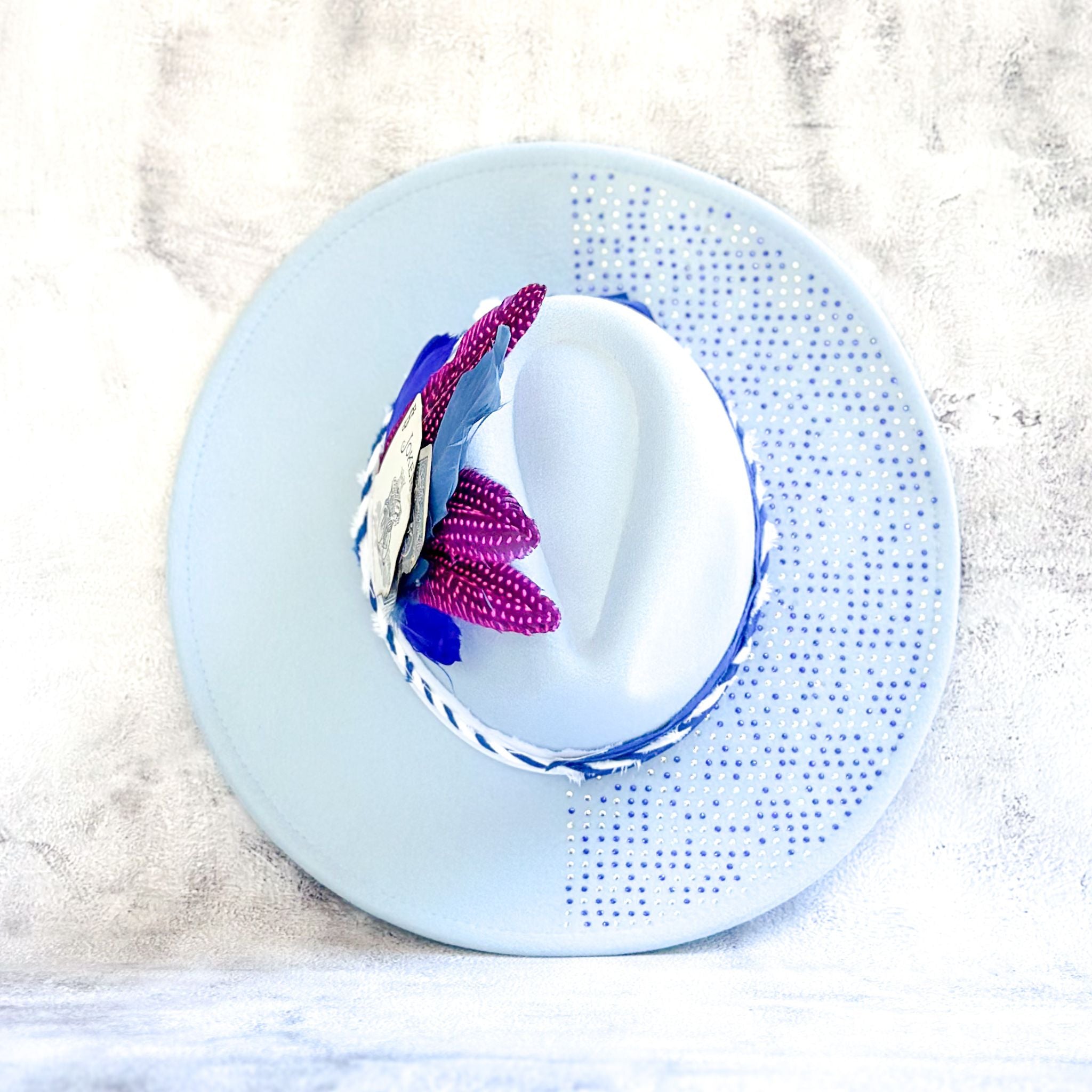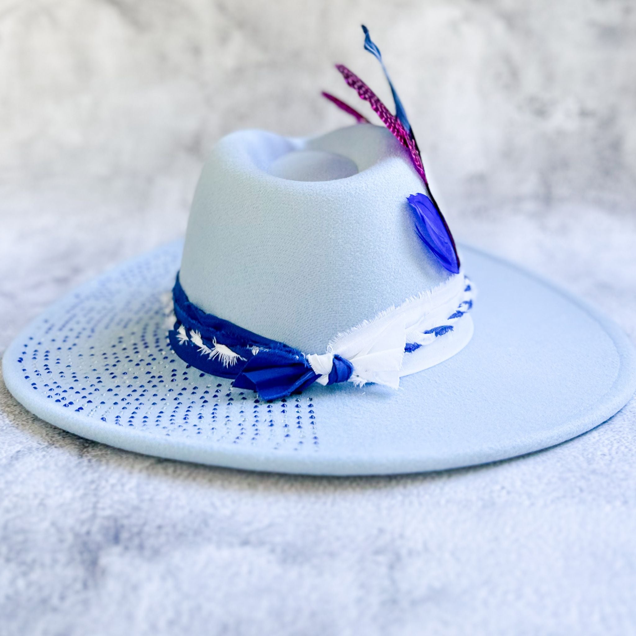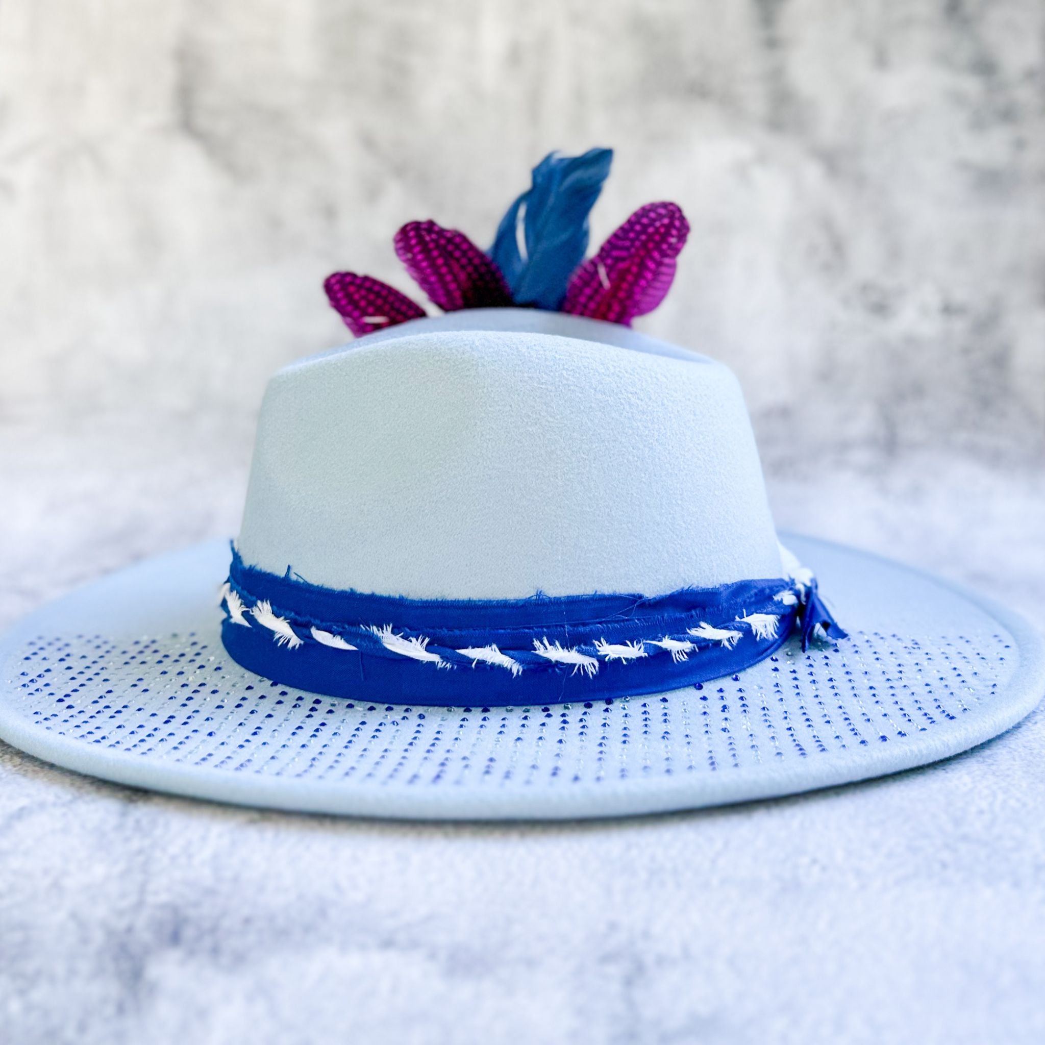 - Design: This hat is adorned with sapphire blue and clear rhinestones. The band is two colors, blue on one side and white on the other. A blue and white braid finishes the band.