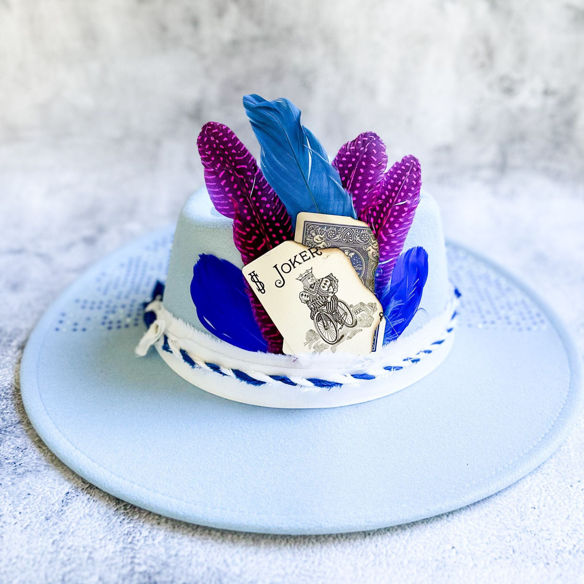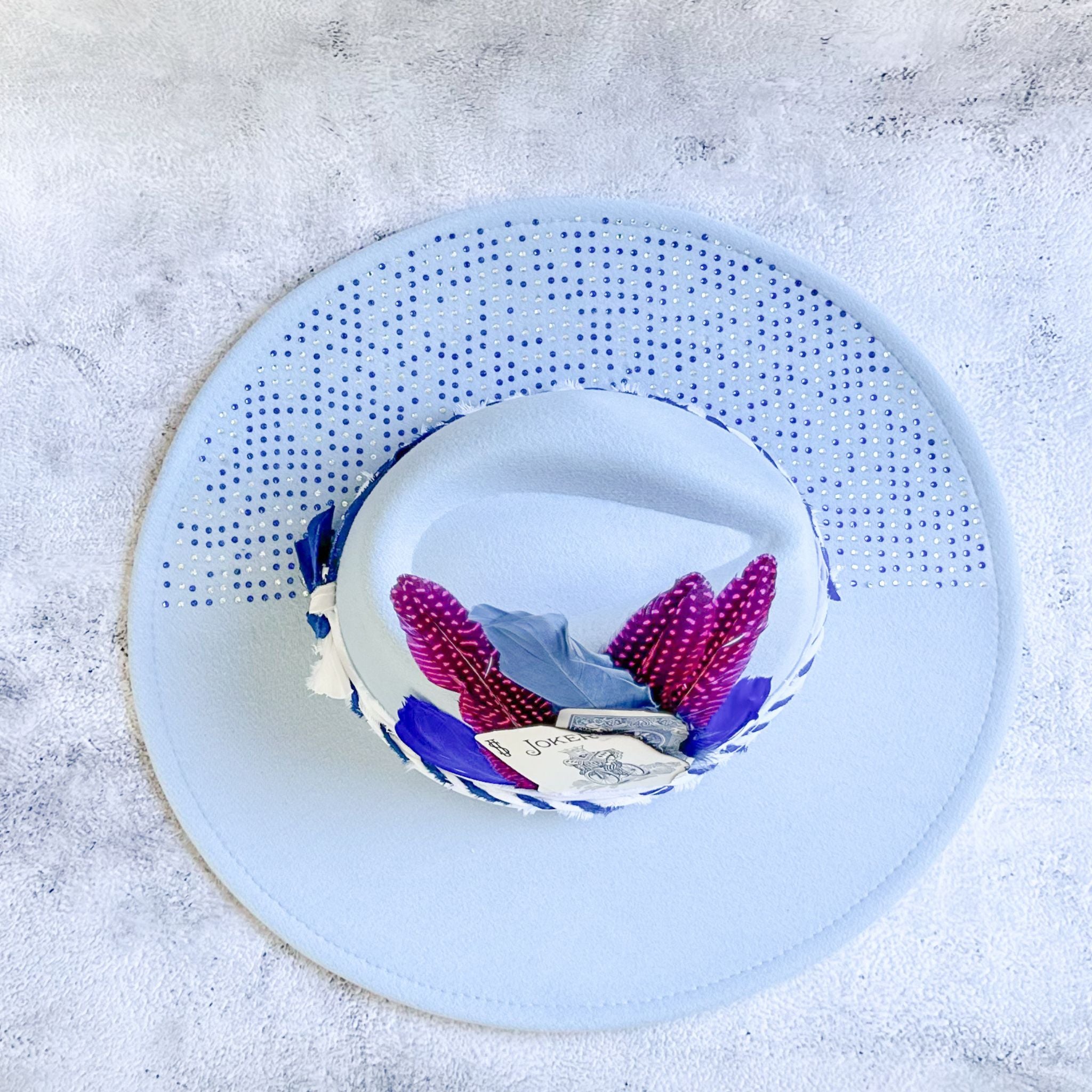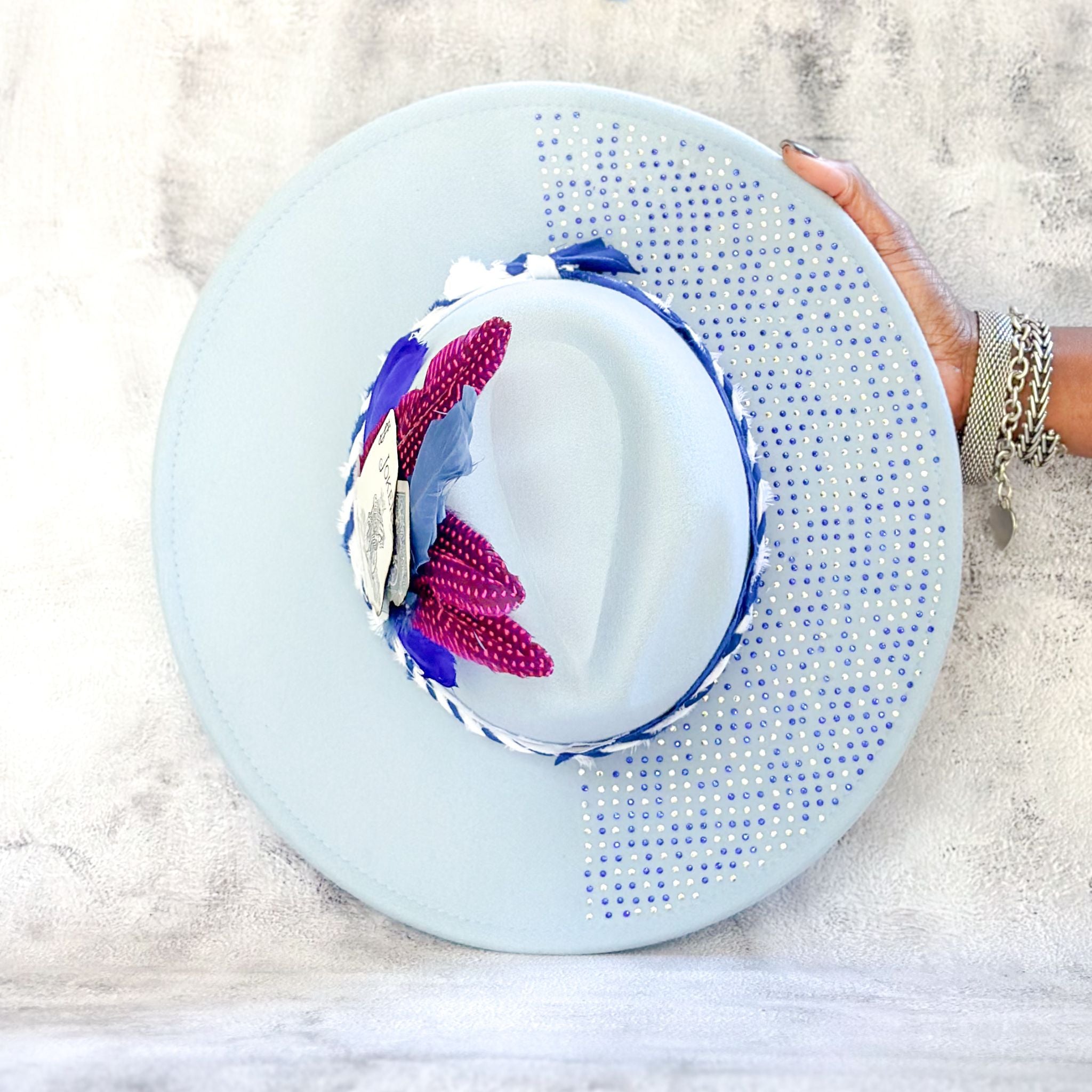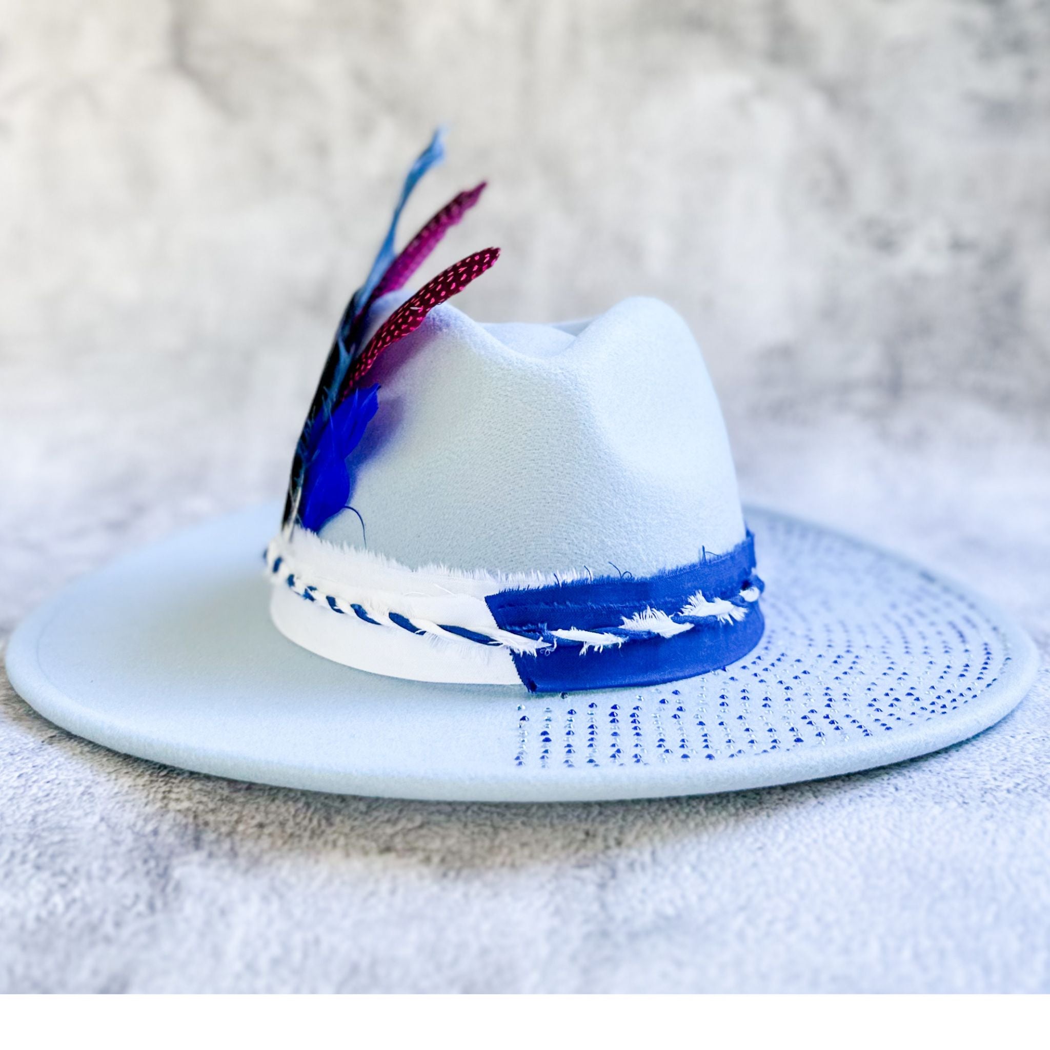 - Design: This hat is adorned with sapphire blue and clear rhinestones. The band is two colors, blue on one side and white on the other. A blue and white braid finishes the band.