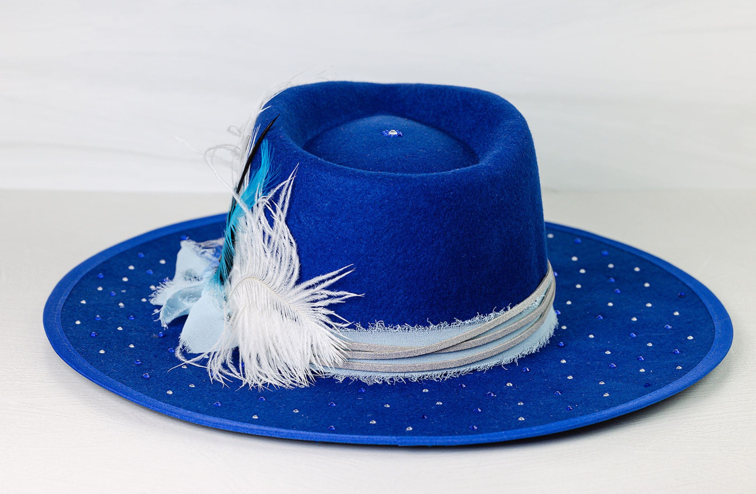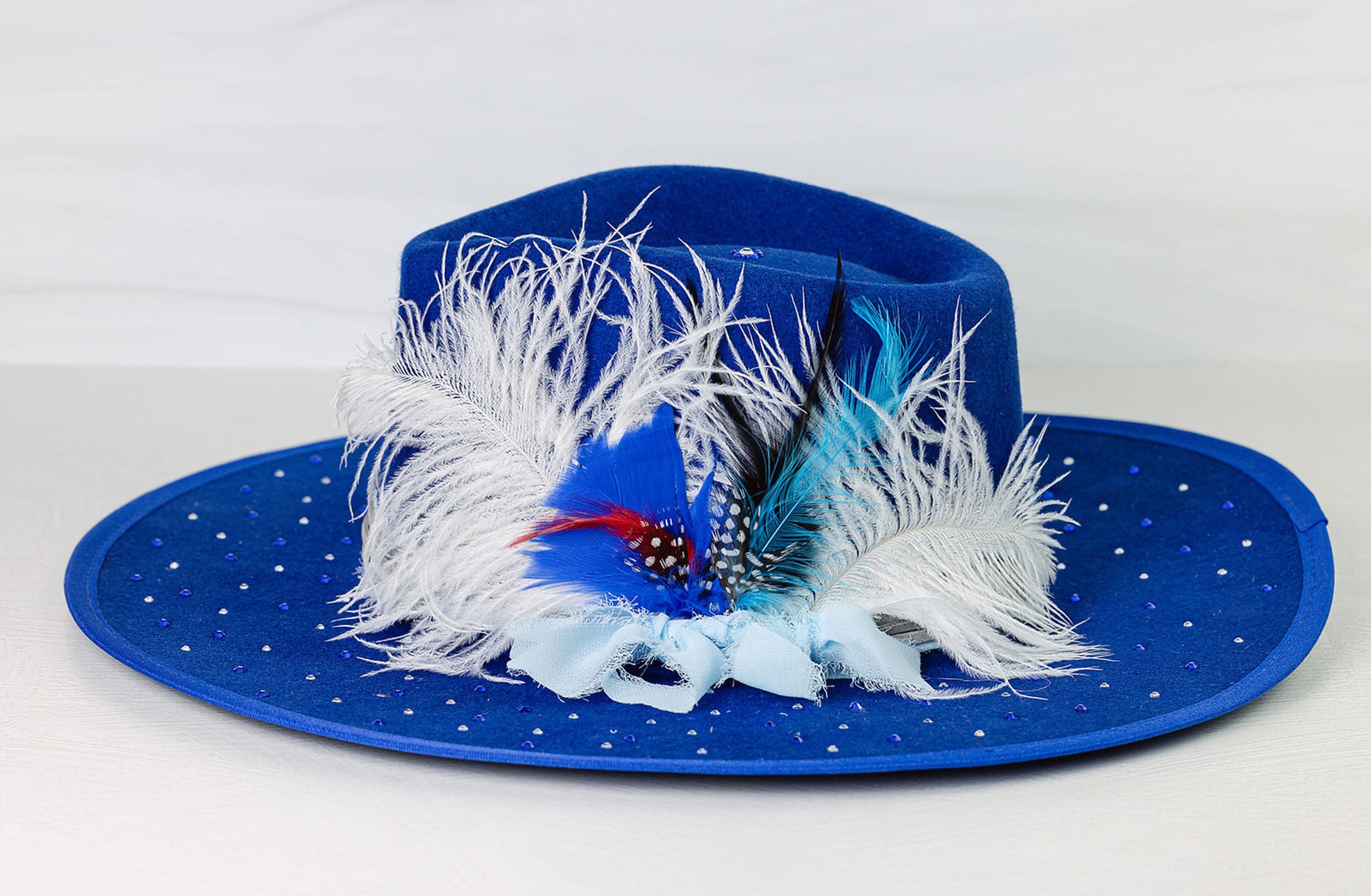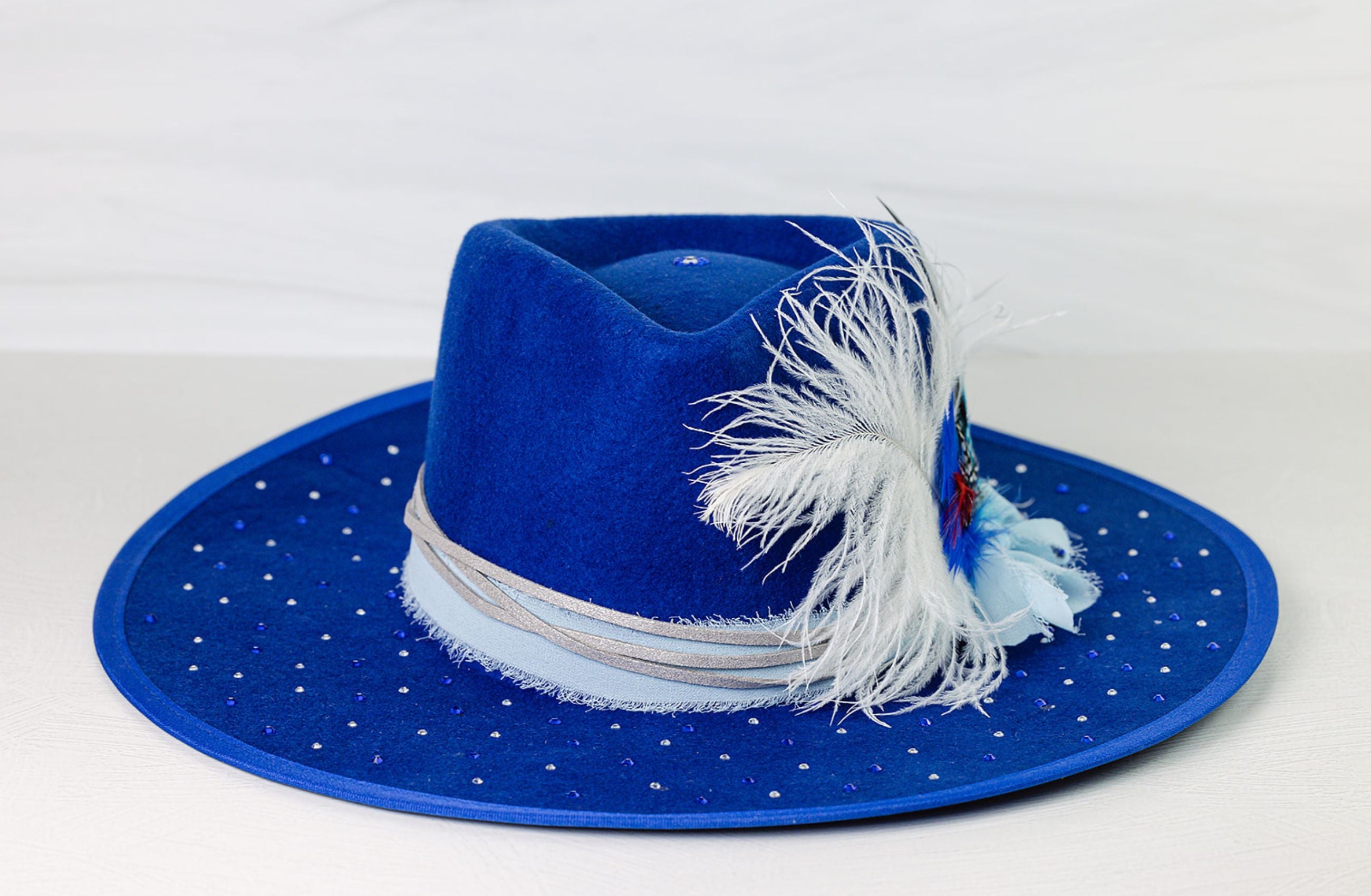 - Design: This hat is adorned with a color shifting purple and blue glass rhinestones on the brim. The white and color feathers are the perfect finishing touch to this fedora along with the small glass rhinestone flower on the crown.