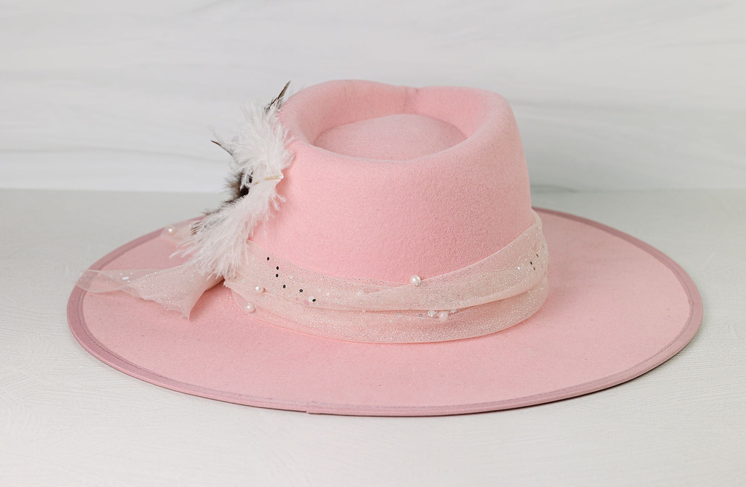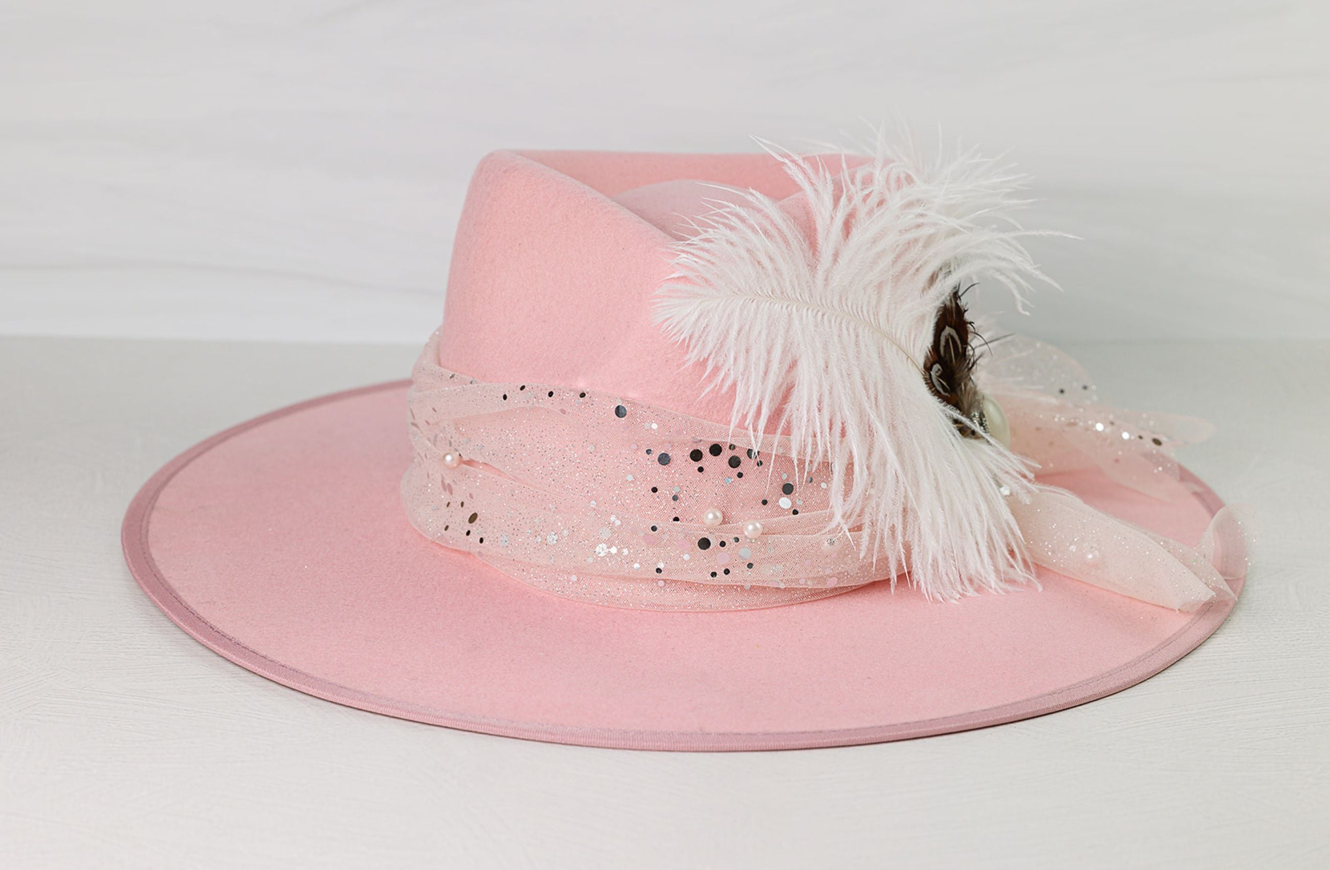 - Design: This hat is adorned with a transparent tulle pearl and sequined band. The rhinestone and pearl broach and feathers add the perfect final touch.