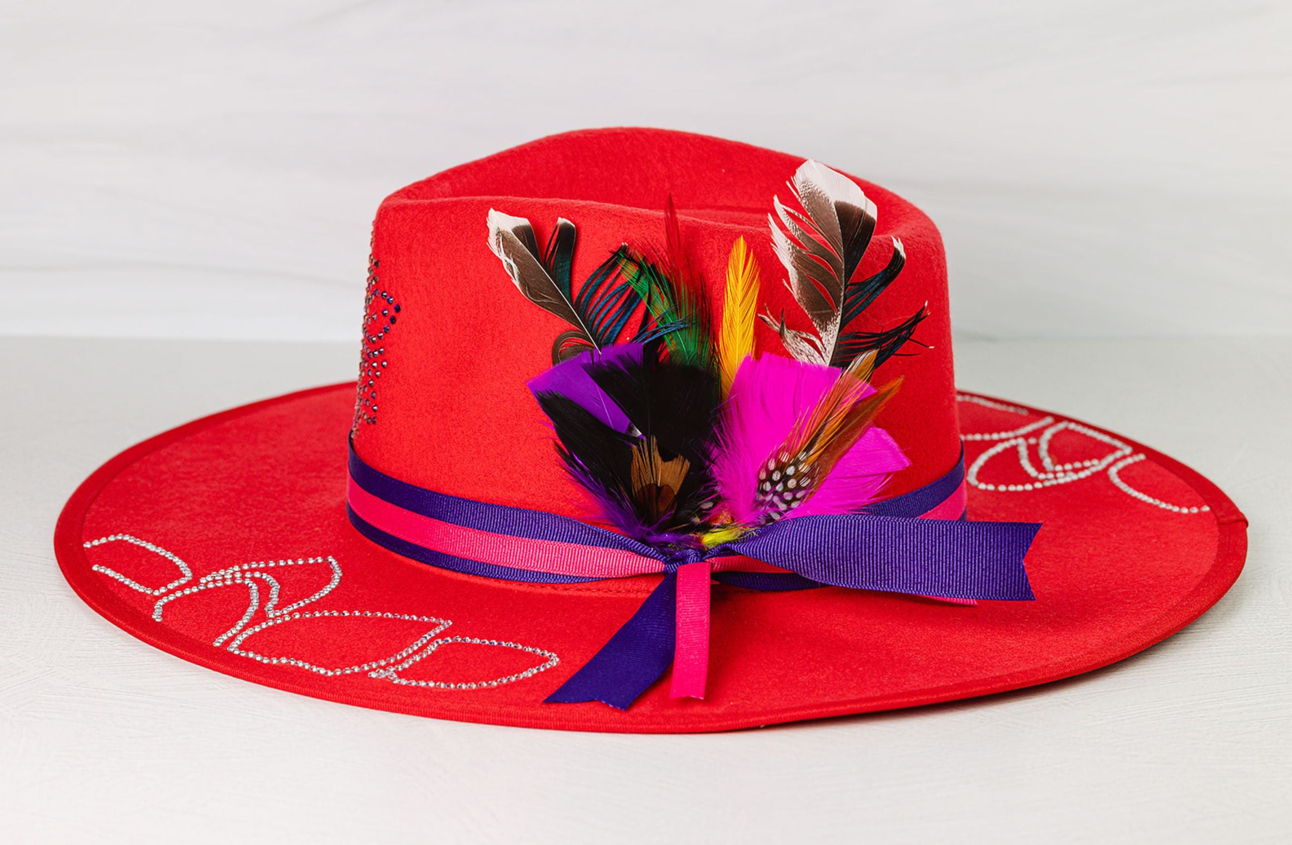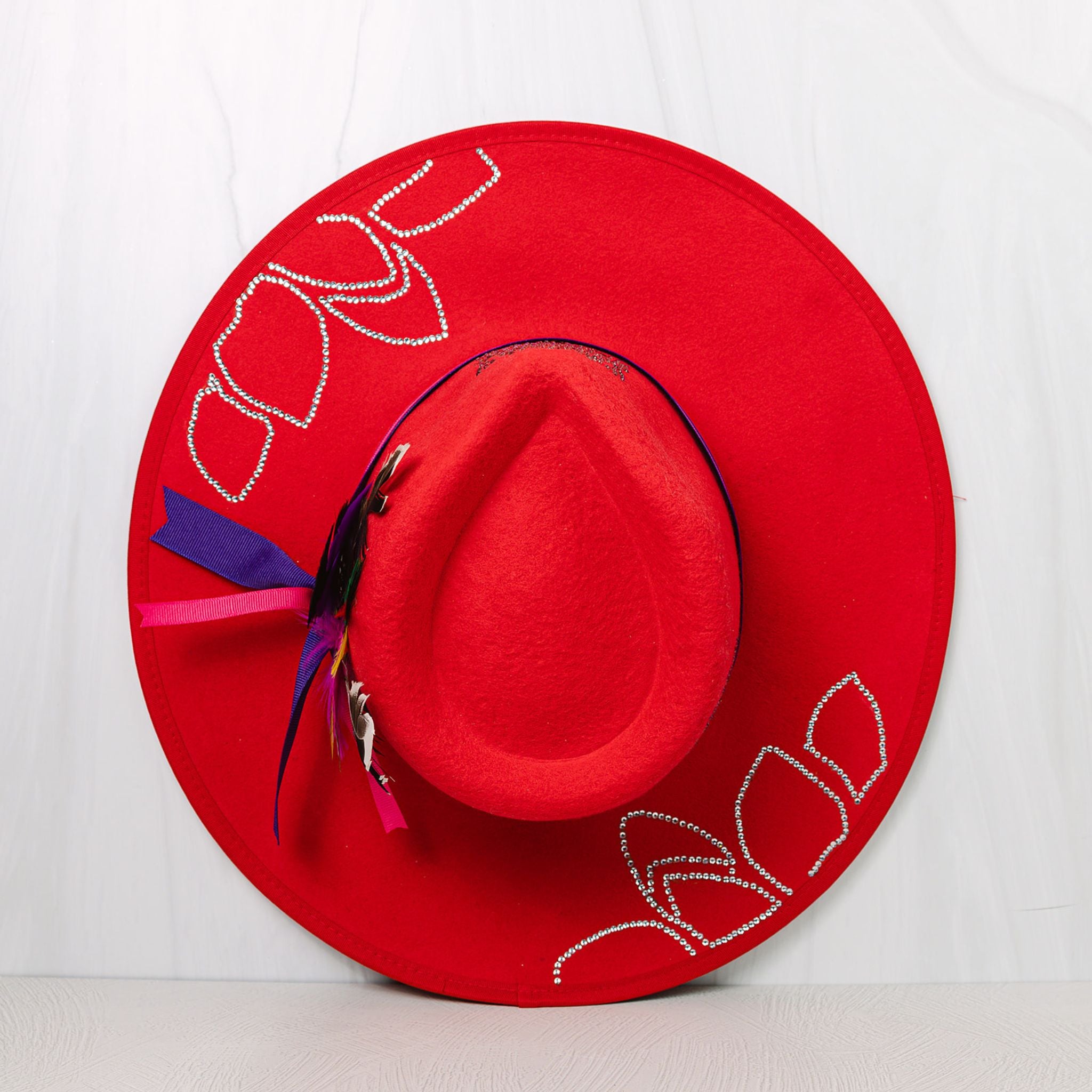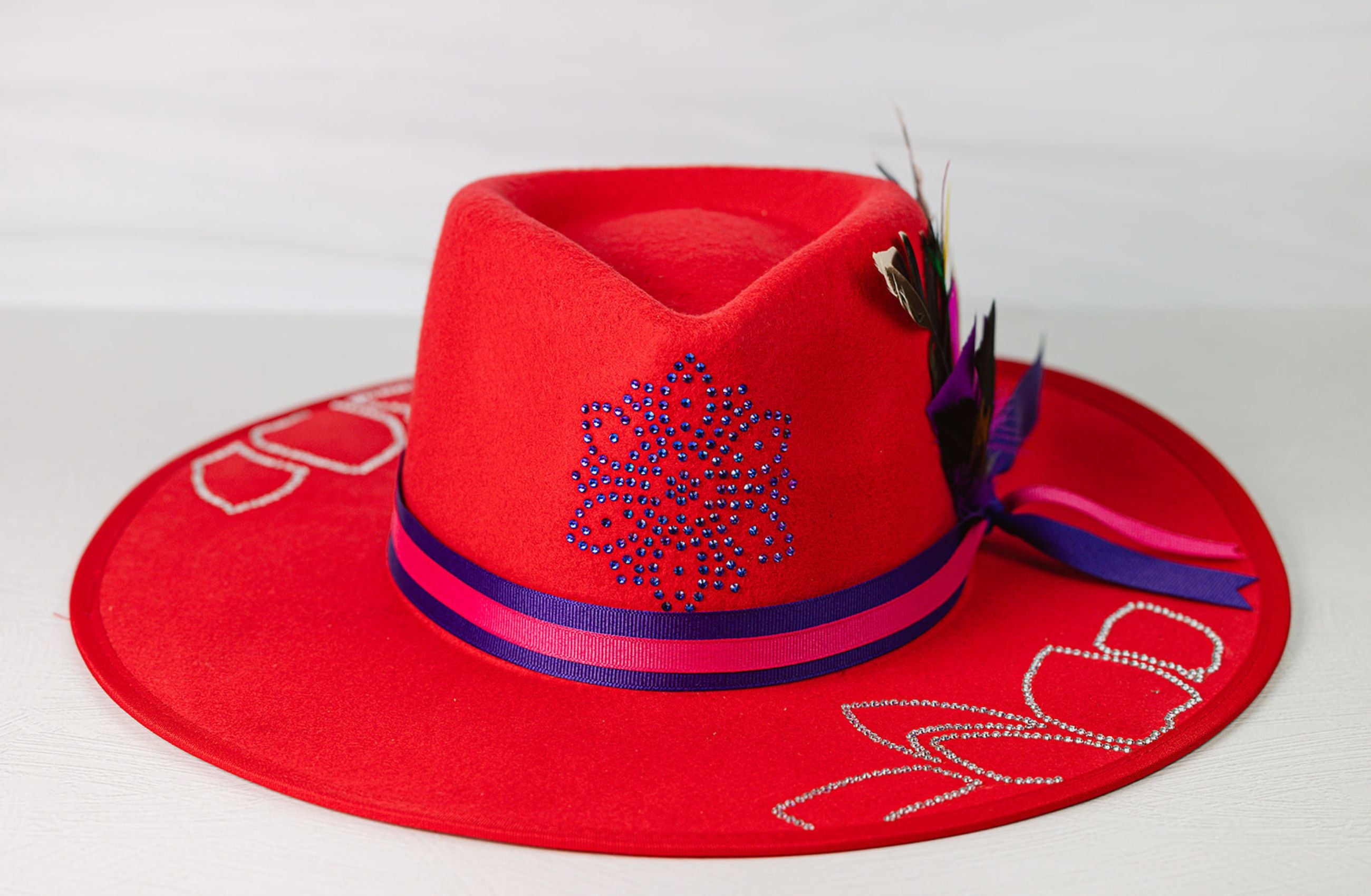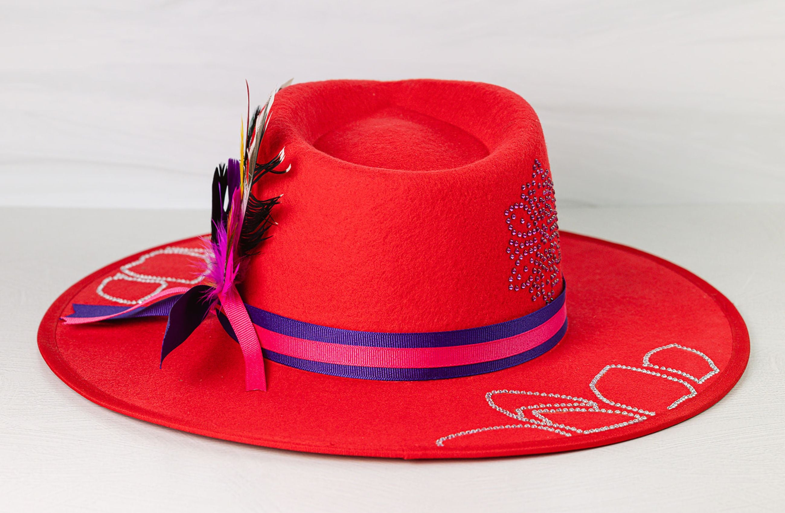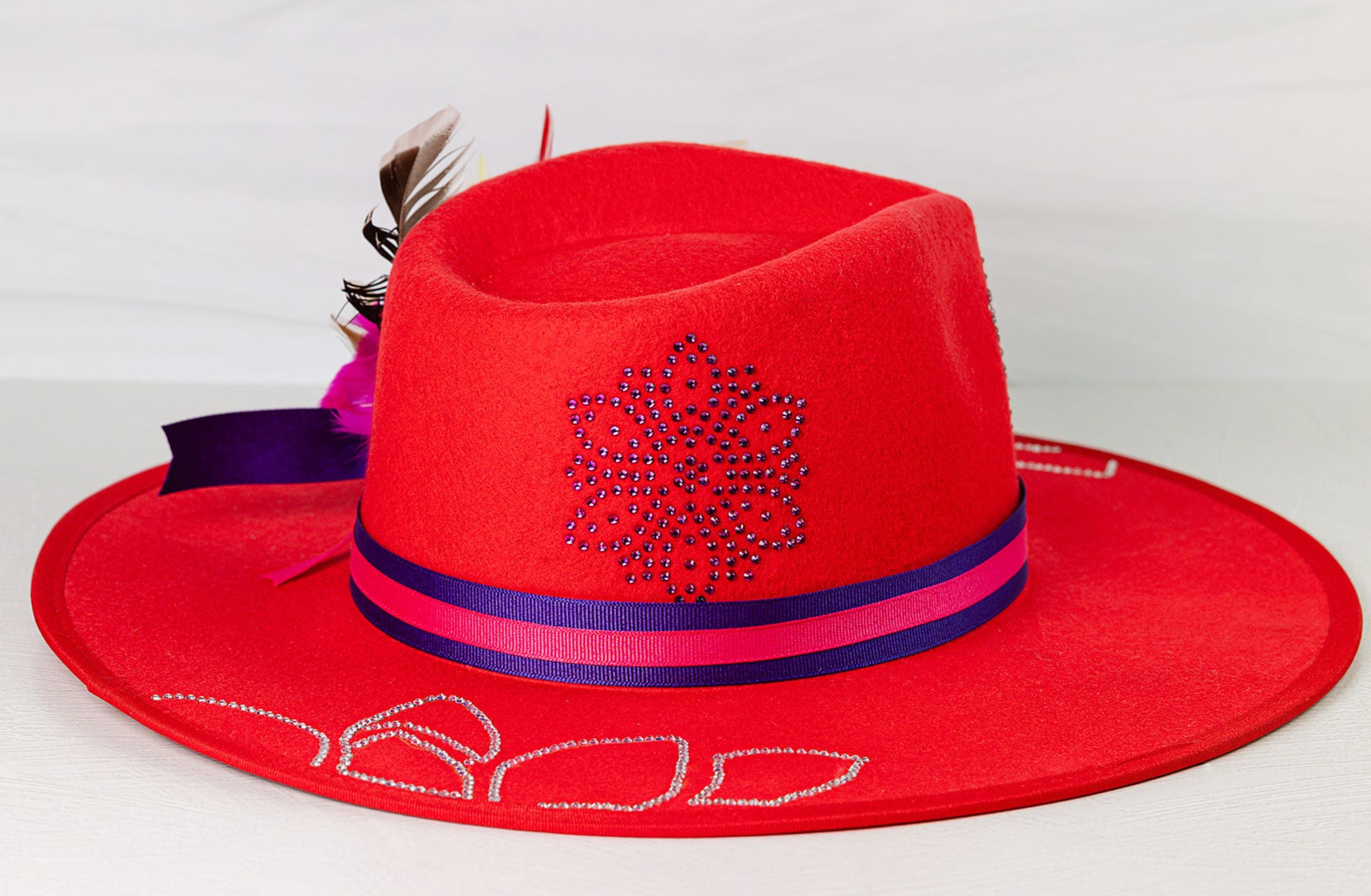 - Design: This hat is adorned with clear glass rhinestone leaves on the brim, trimmed with a pink and purple band and finished with purple color shifting flowers and fethers.