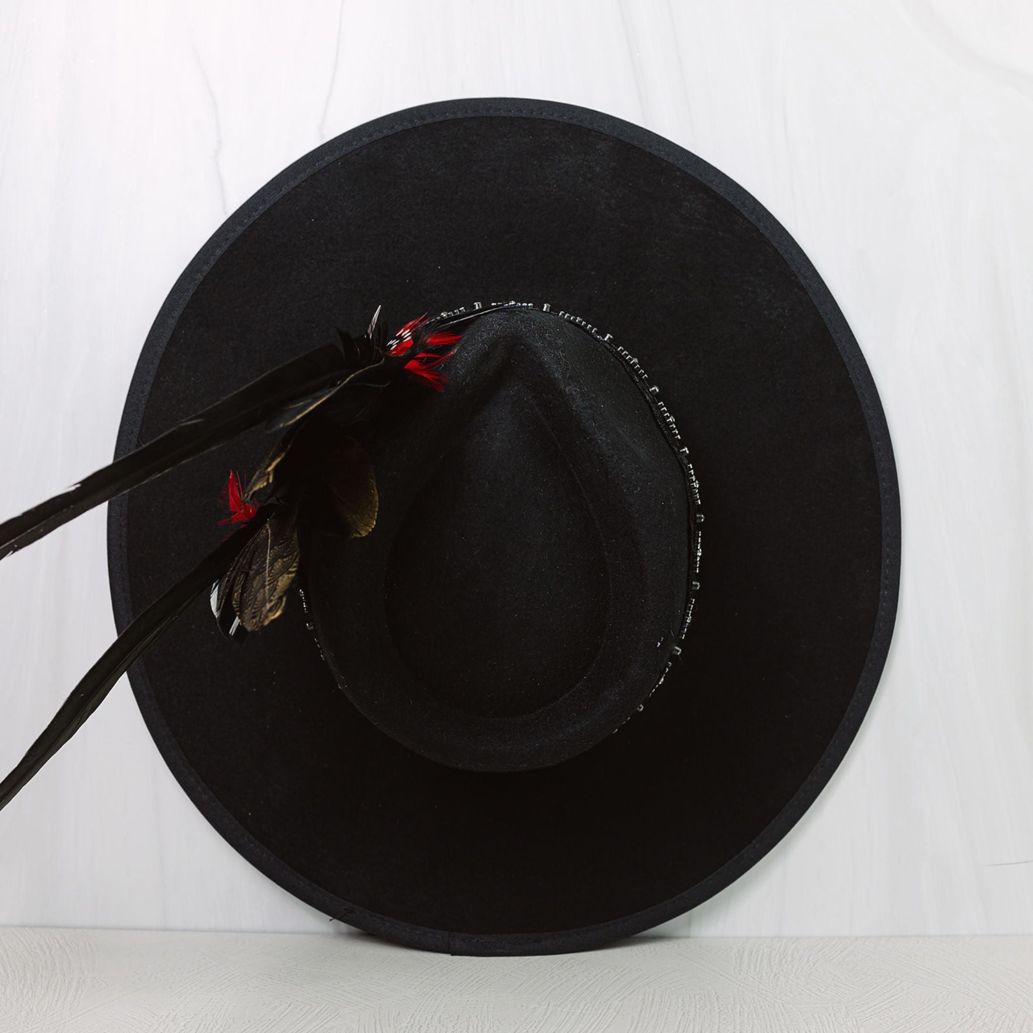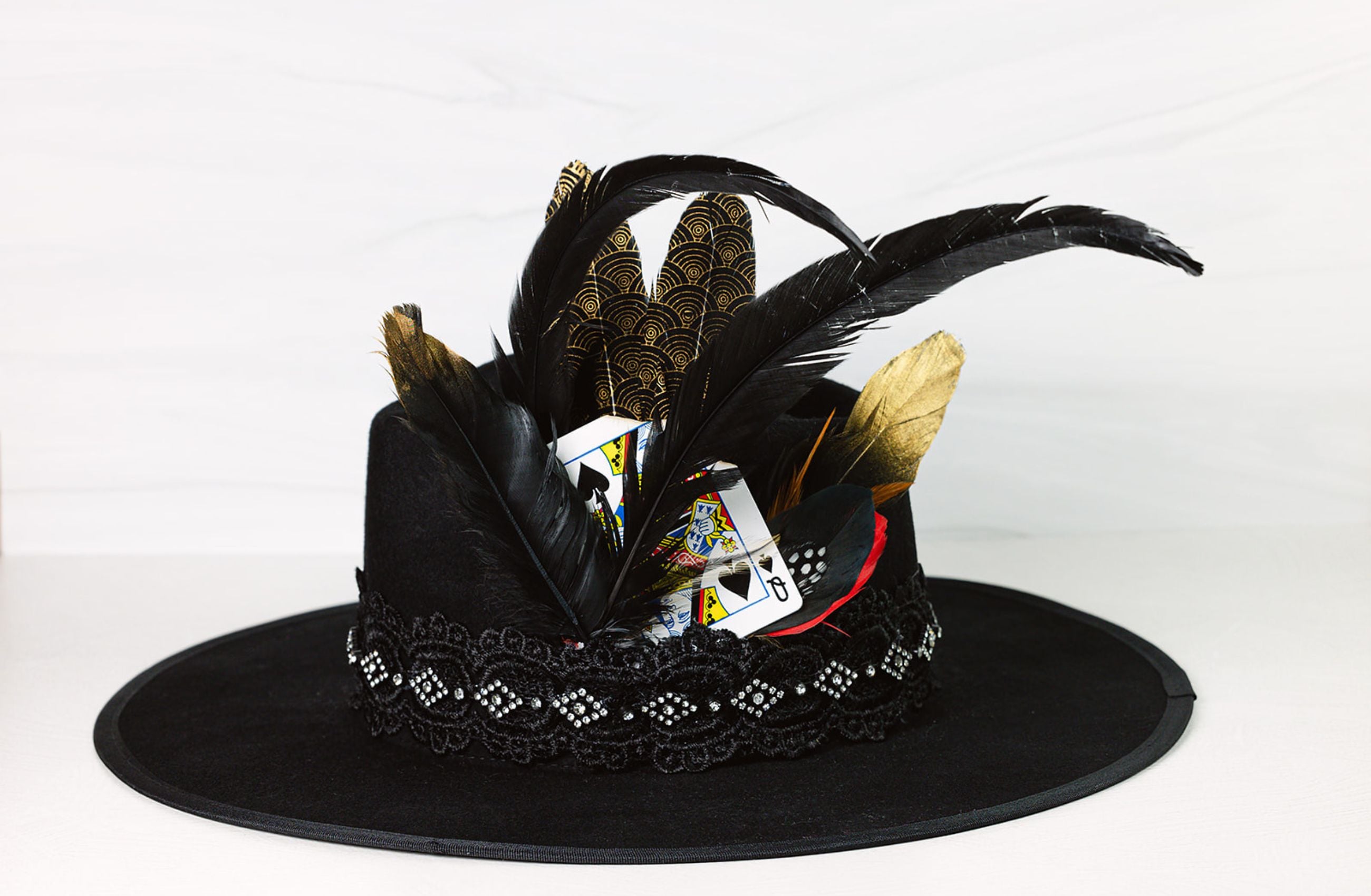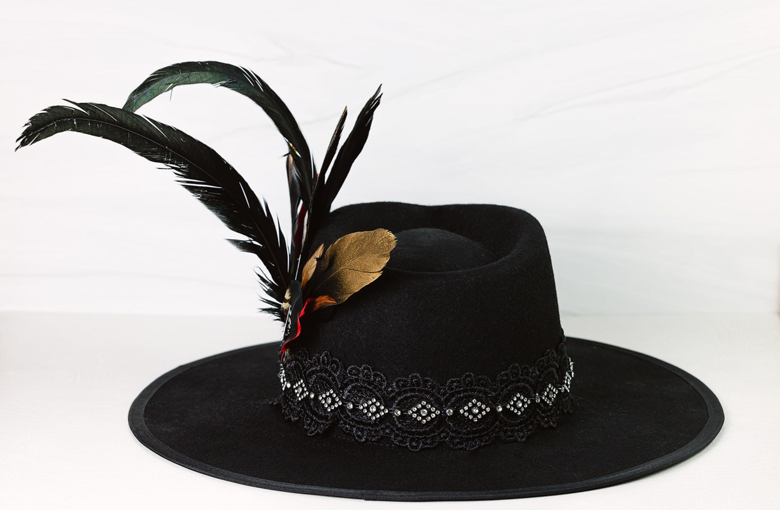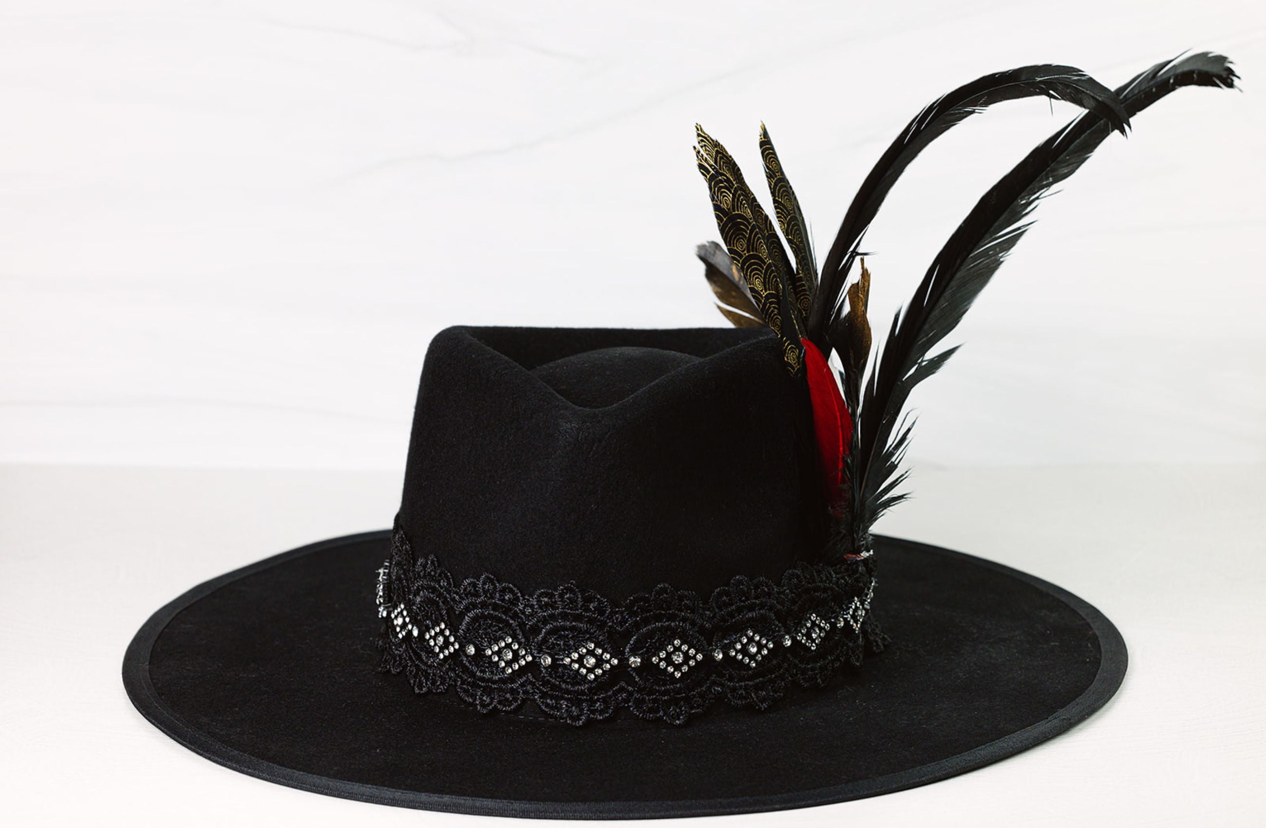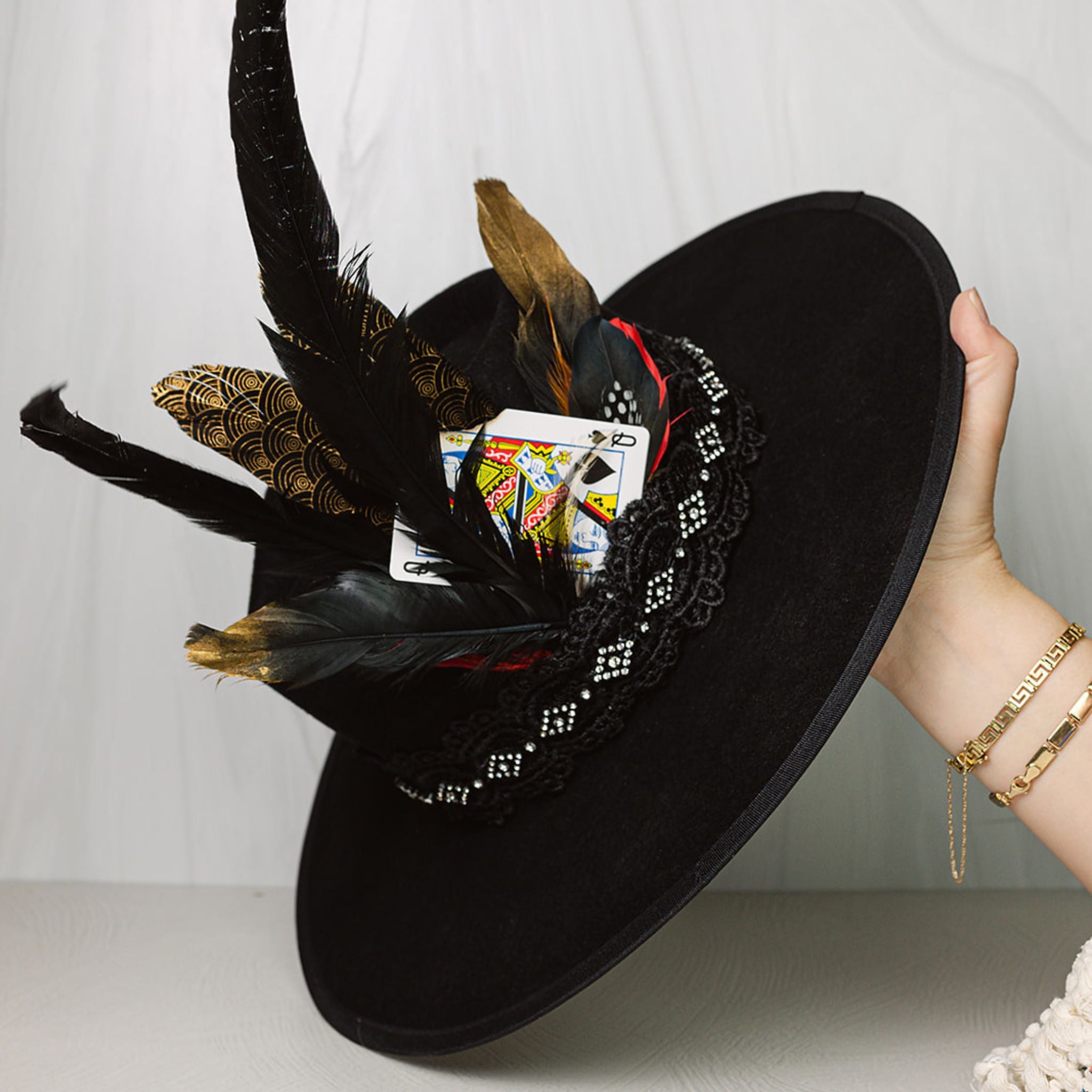 - Design: This hat is adorned with a black lace and a rhinestone hat band.The finishing touches of the singed Queen of Hearts playing card and black and gold feathers.