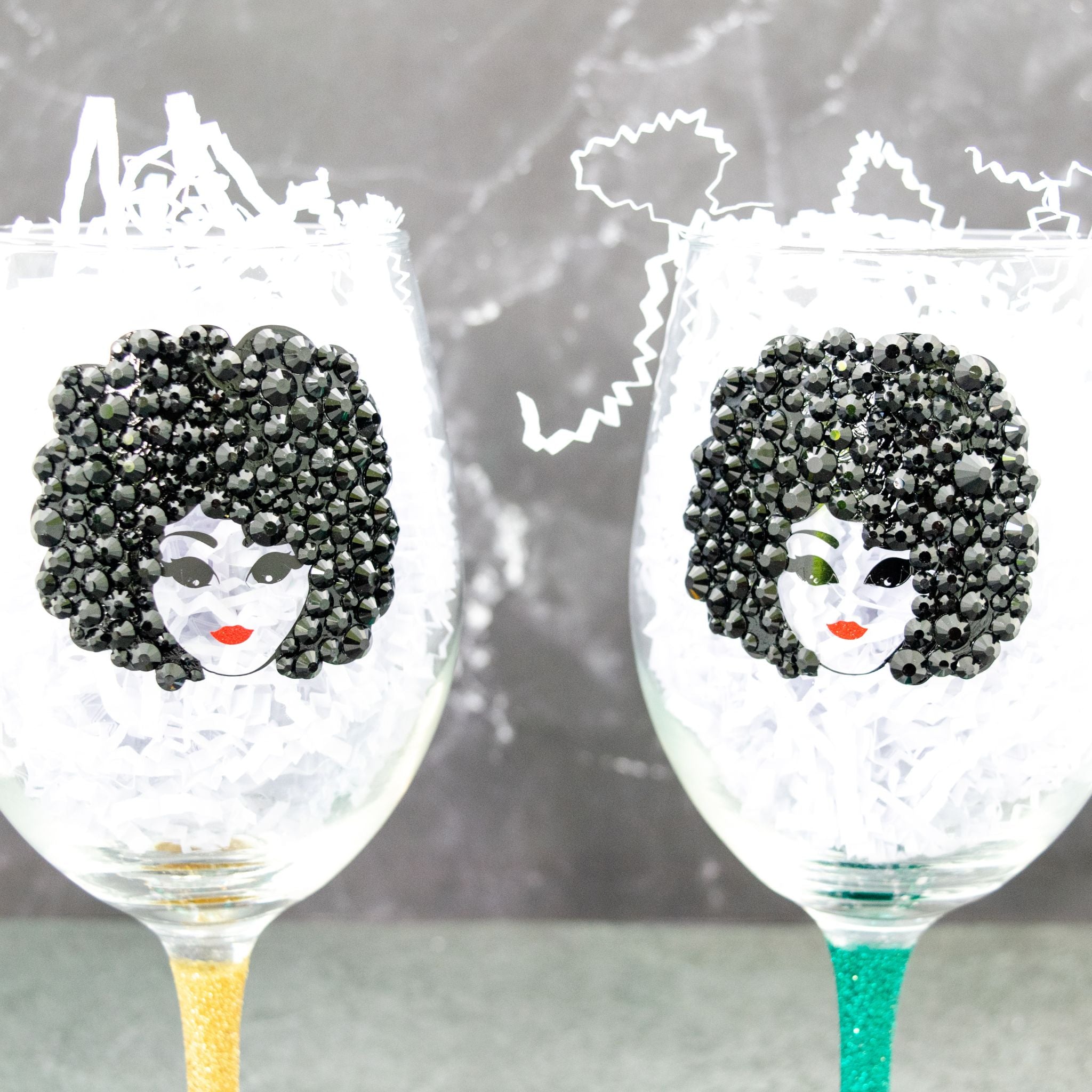 This exquisite wine glass features a unique design, with its bottom dipped in glitter for a touch of sparkle, while the iconic afro of the woman depicted is adorned with meticulously hand placed black glass rhinestones.